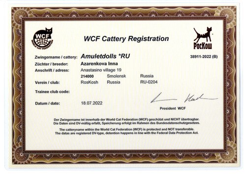 Питомник зарегистрирован в Российском Фелинологическом клубе "РосКош" г.Москва , который входит во Всемирную Федерацию кошек World Cat Federation "WCF".