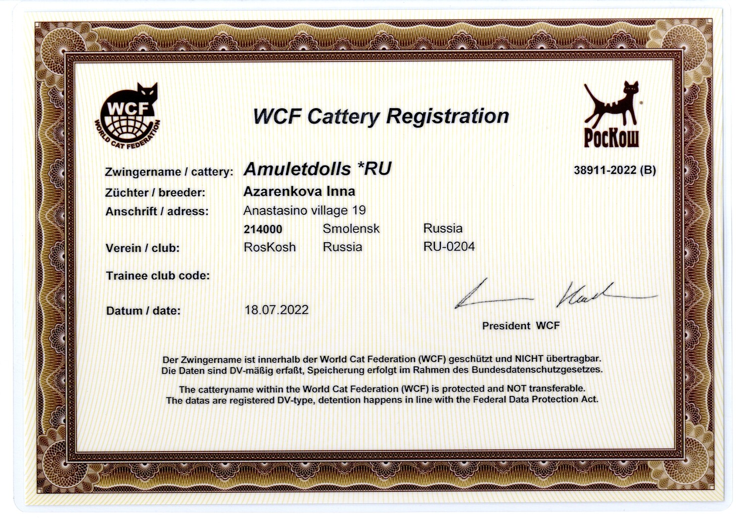 Питомник зарегистрирован в Российском Фелинологическом клубе "РосКош" г.Москва , который входит во Всемирную Федерацию кошек World Cat Federation "WCF".
